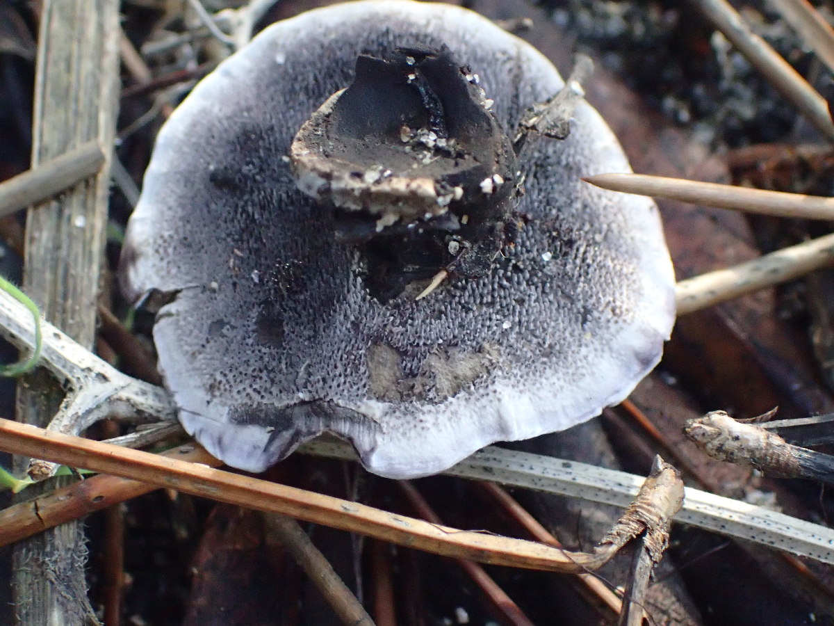 - Chapeau noir, de 5-10 cm de diamètre, à marge blanche