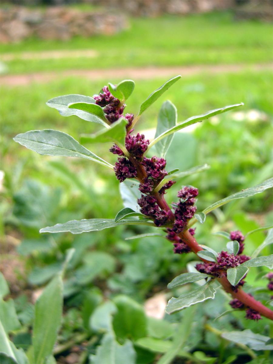 Merci Ustal, effectivement, les feuilles de Chenopodium rubrum (ou Oxybasis rubra) sont simplement lancéolées au tout début puis losangées-découpées (hastées peut-être, pour employer un vocabulaire que je ne maîtrise pas) et on aperçoit sur la photo certaines feuilles qui semblent avoir cette dernière forme.