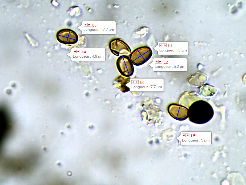 J'ai l'impression qu'il y a deux sortes de spores sur ta photo micro... tu as mesuré des spores colorées, mais il me semble voir une spore différente, non colorée.