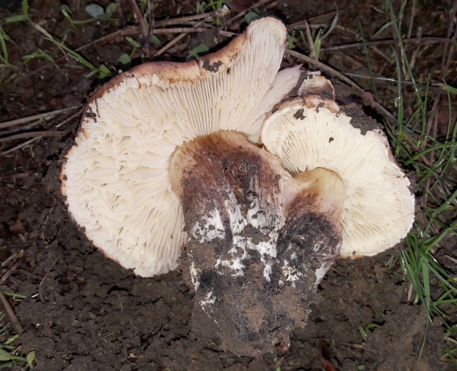 toujours de l'île d'aix mais vu aussi à Fouras sous des pins en alignement... tricholoma ? le chapeau a des teintes vaguement rougeâtres, les vieux exemplaires foncent fortement, les bords de lames se pigmentent de pourpre foncé.. odeur fongique