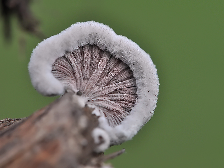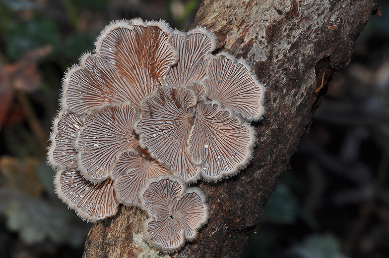 J'ai découvert ces champignons sur des branches d' arbres fruitiers Ils sont blancs aux bords striés se détachant bien du support ; je n'ai pas trouvé leur identification