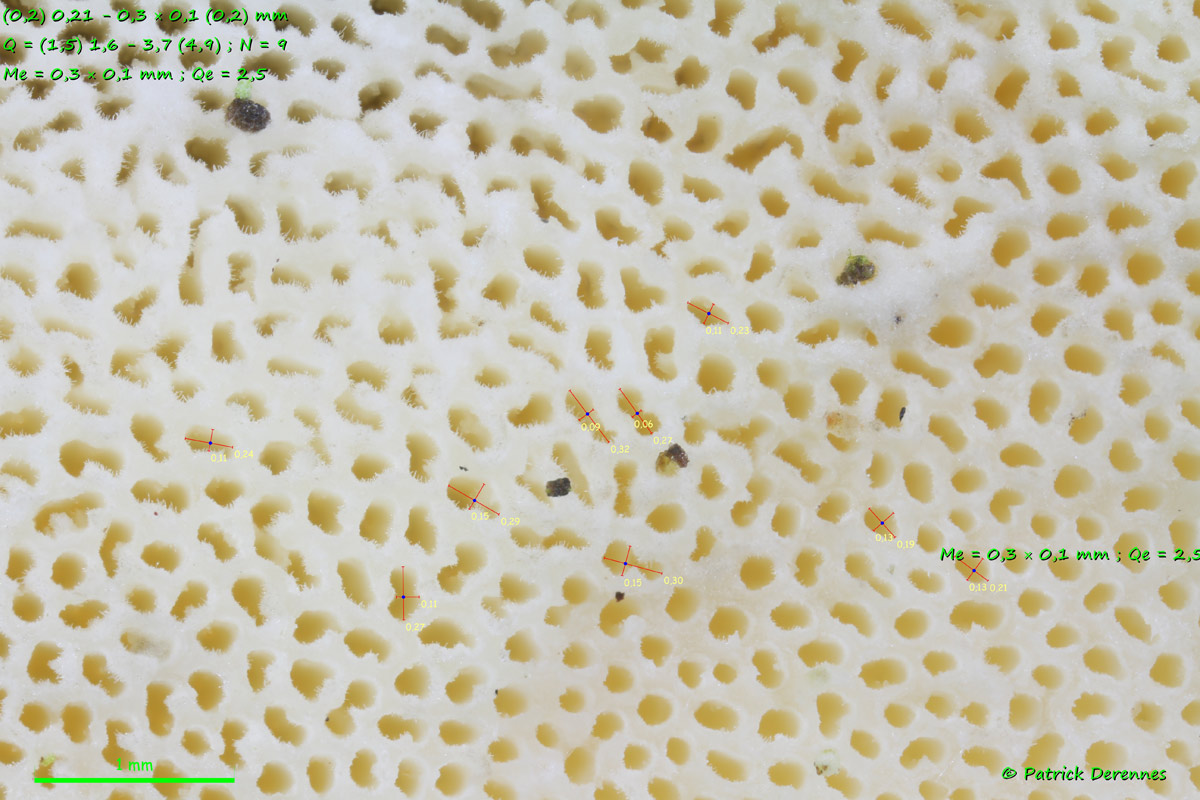chapeau de 38 x 33 mm, résupiné blanchâtre (terrain) puis orangeâtre (au bureau), à pores de dimension moyenne 0,3 x 0,1 mm