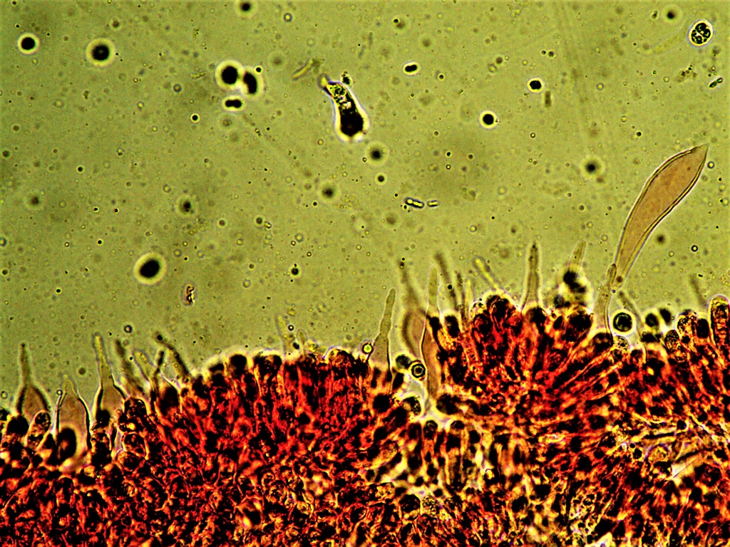 Sur le terrain il avait été nommé M. galericulata, mais les cystides terminées par mince bec cylindrique ne collent pas et ressemblent bien à celles de M.abramsii qui est printanière. Le seul problème est que je n'ai pas vu de caulocystides et je n'ai pas d'autre idée.