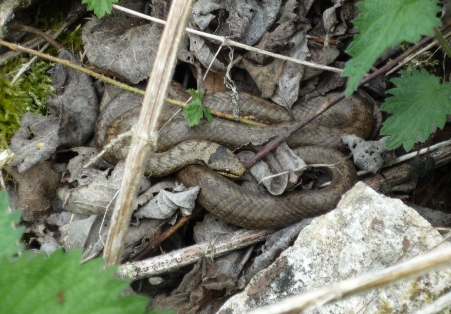 Je dérange ce (ces ?)serpent chaque fois que je vais chiner dans un vieux tas de gravats/terre en bordure de forêt. Il n'est pas très farouche. Il n'a même pas daigné se dérouler lors de la photo, et s'est juste contenter de me tirer sa langue fourchue, lorsque ma présence était inférieure au mètre. Parfois il détale et s'enfile rapidement dans des trous pierreux entre la végétation. Sa couleur au soleil est alors d'un beau marron luisant. De mémoire et approximativement, son diamètre est un peu inférieur à celui d'un doigt vers la tête, et sa longueur est assez grande (peut-être 60-70 cm)