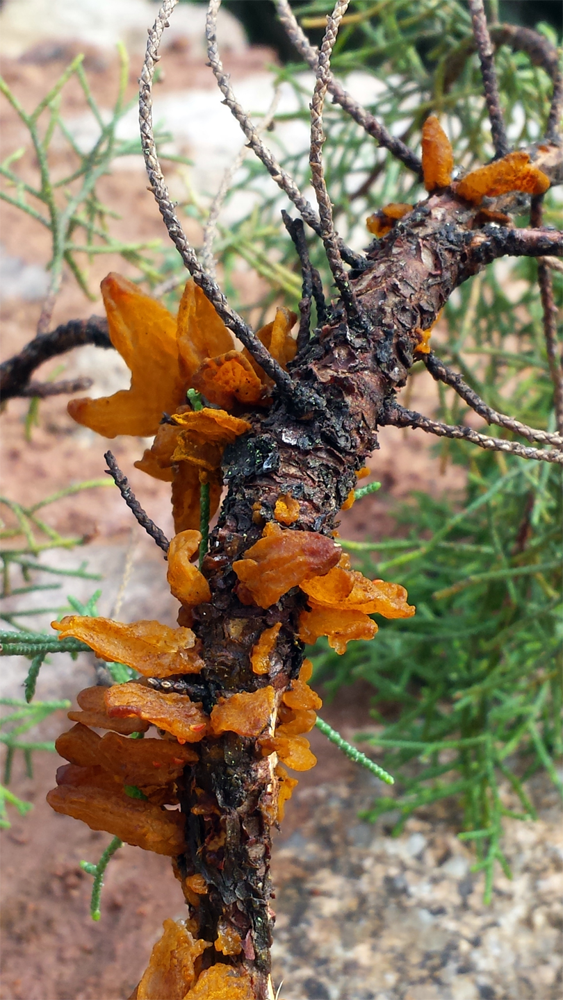 Dans la foulée de Jean-Pierre, vous avez tous trouvé Gymnosporangium confusum, bravo. À vrai dire j'étais personnellement parti sur Gymnosporangium sabinae, la rouille grillagée du poirier, mais il s'agit d'espèces très proches.