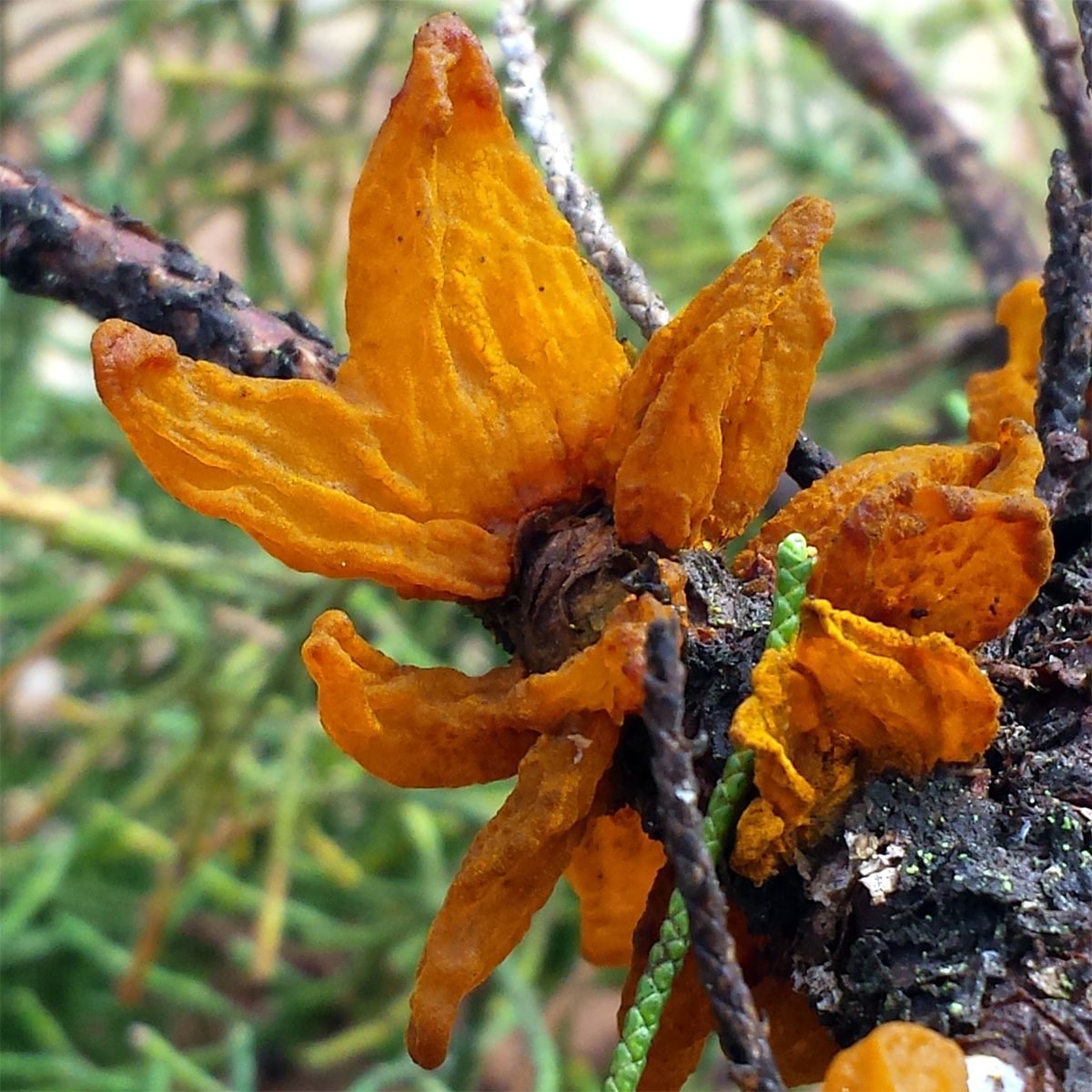 Dans la foulée de Jean-Pierre, vous avez tous trouvé Gymnosporangium confusum, bravo. À vrai dire j'étais personnellement parti sur Gymnosporangium sabinae, la rouille grillagée du poirier, mais il s'agit d'espèces très proches.