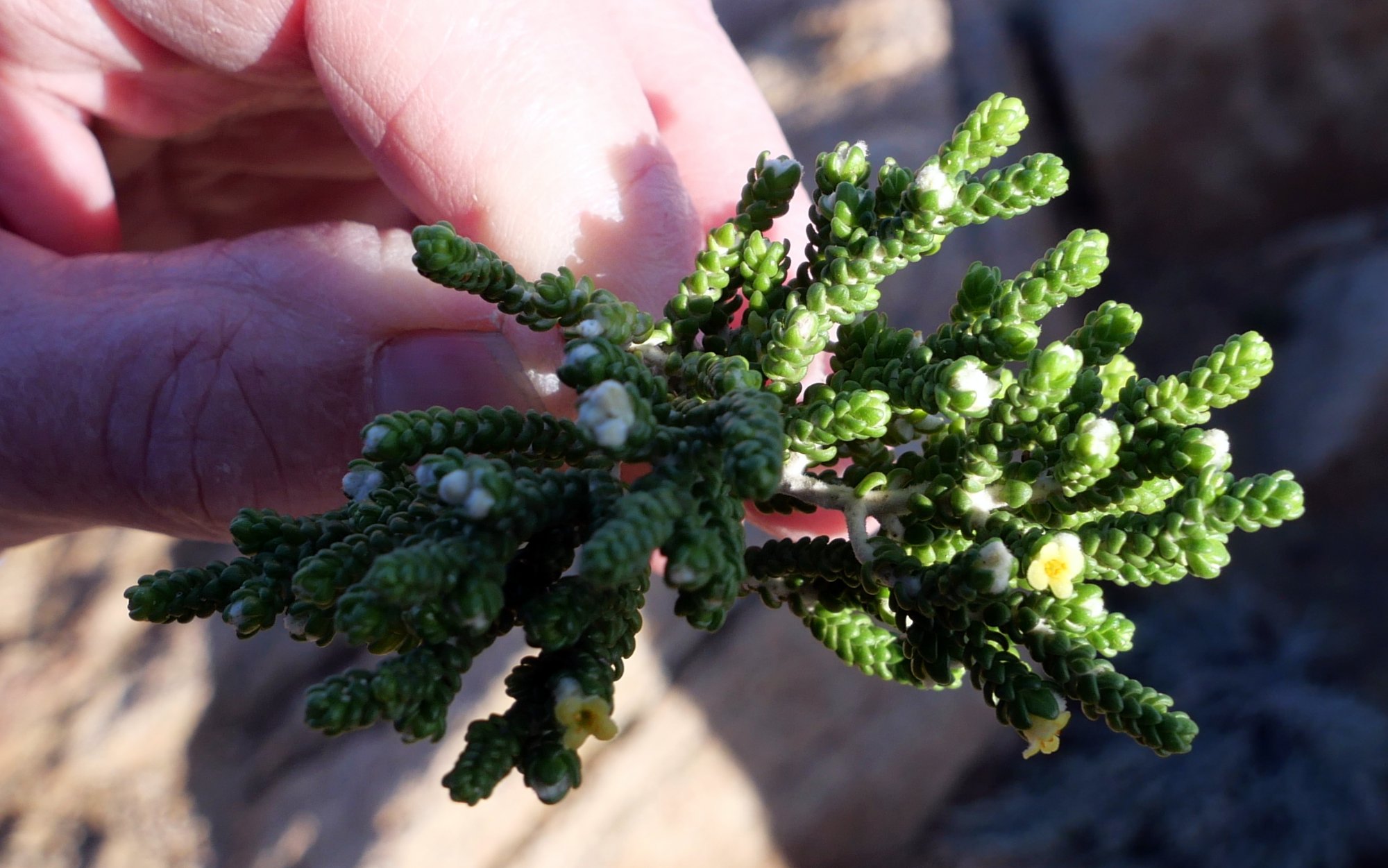 Peut-être Thymelaea hirsuta. La passerine hérissée aime bien les sols sablonneux ou rocailleux, ce qui semble être le cas sur la photo. Je l'ai souvent croisée en bord de mer, et elle m'a également fait vaguement penser à la salicorne