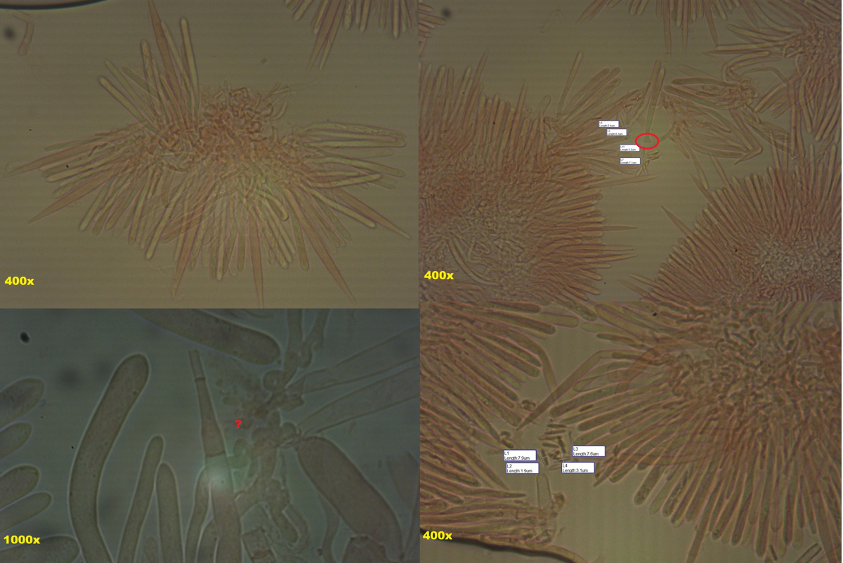 Sur la photo de l'hyménium, on ne voit pas de gouttes dans les paraphyses, ce qui veut dire que sur la première photo il s'agit d'un artéfact (mortes ?).