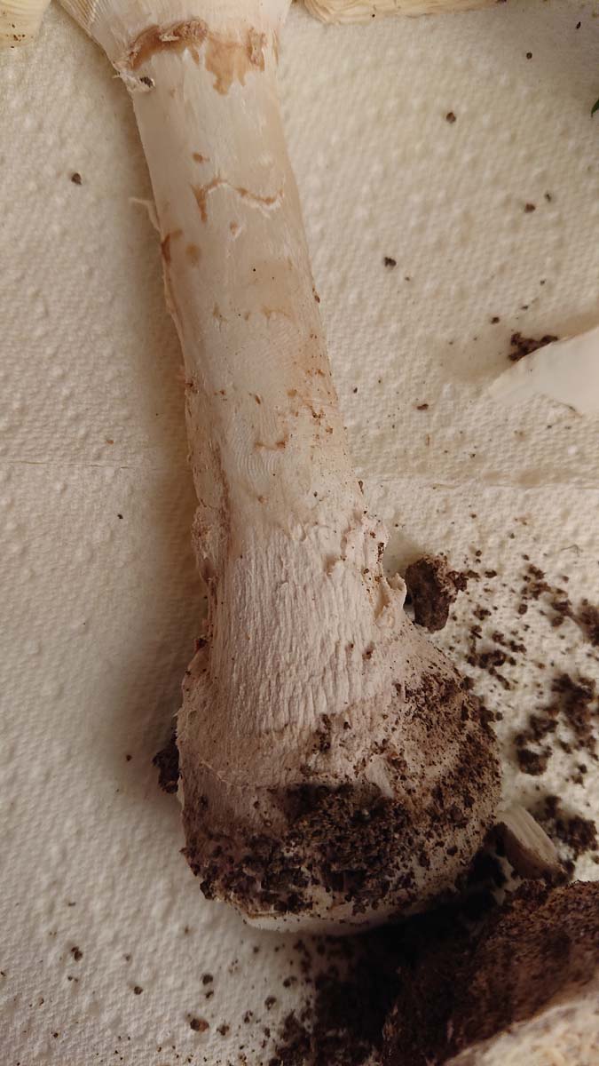 A priori, même s'il y a des nuances de fauve sur le chapeau très vieilli, je m'oriente plutôt vers un chapeau blanc/crème/ochracé très pâle. Pas de volve, mais plutôt un bulbe, avec un très léger bourrelet.