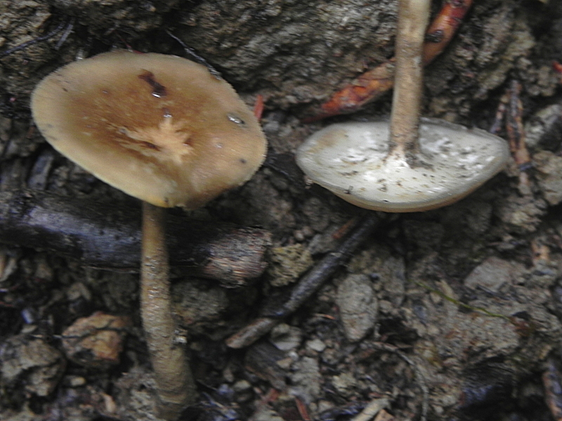 Tout gris-brun, très radicant ( racine longue enfoncée dans la boue ), avec un hymenium presque lisse.