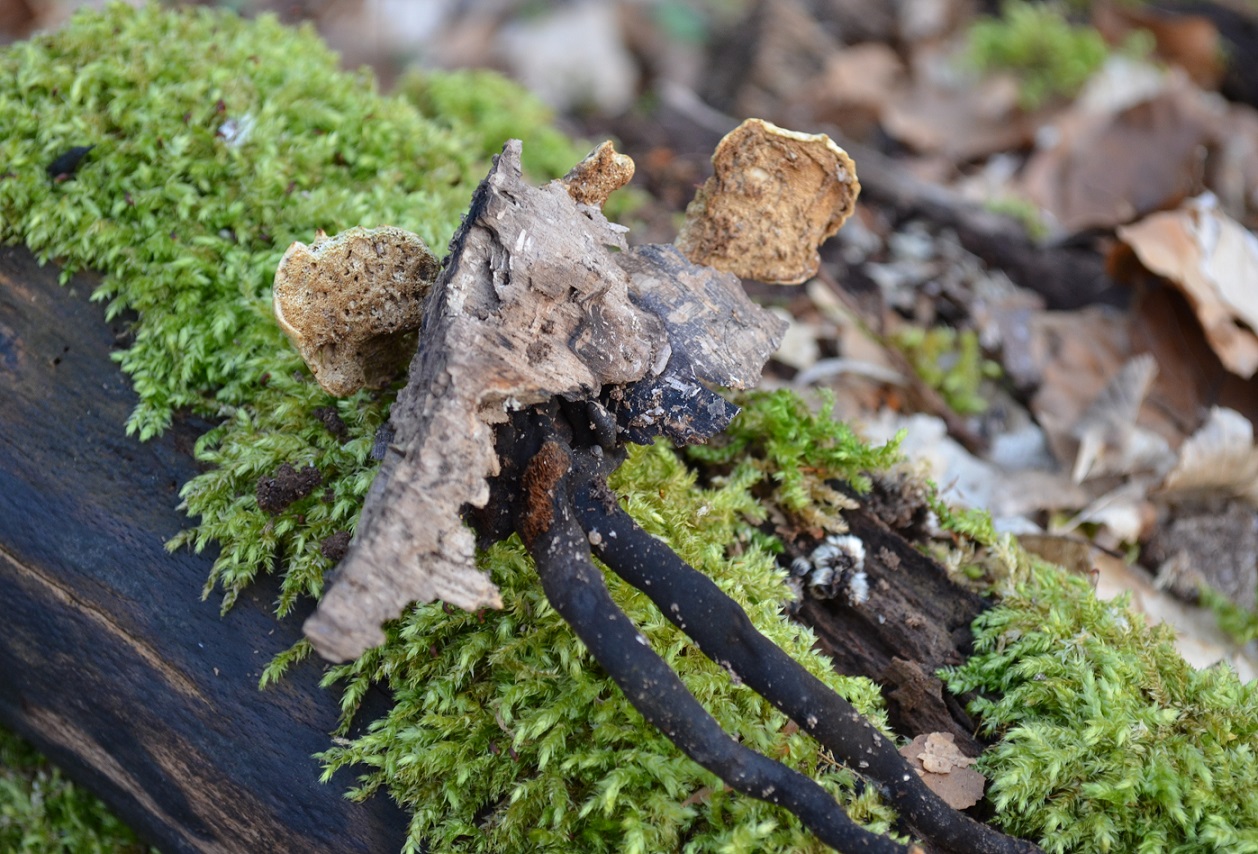 On y vois un polypore avec trois chapeau, tous petits, pris dans un morceau de bois et... Avec des espèces de longs pieds radicants ???