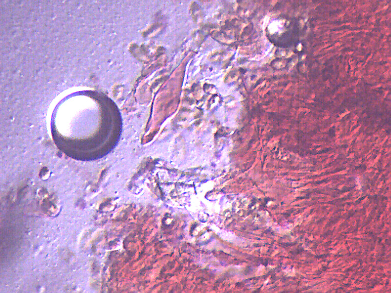 Voici de mauvaises photos , mais plus précises ( agrandissement x 1000 cette fois ) de cystides et d'un amas de spores.