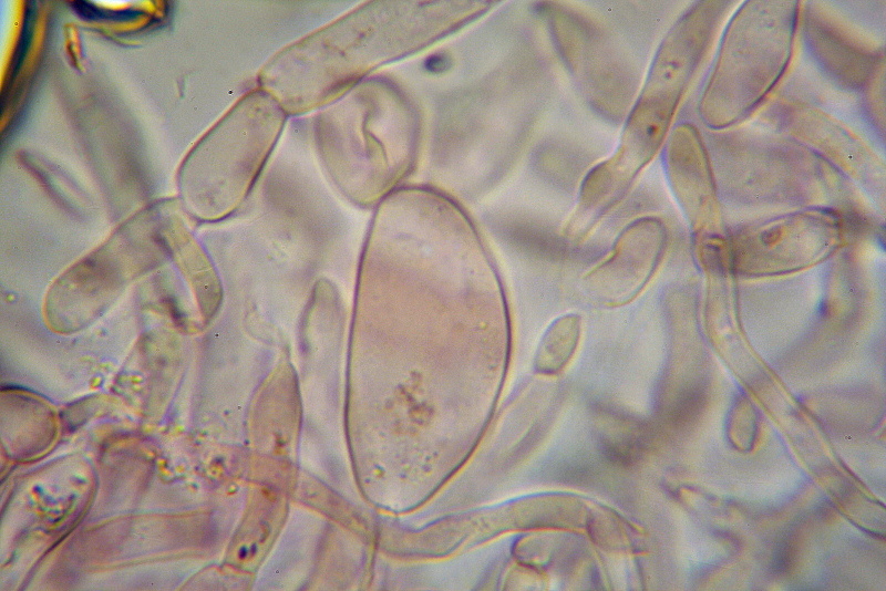 Pileipellis composta da peli pluriarticolati, formata da una serie di cellule di cui quella basale spessa (8,2) 9,7 -12,8 - 14,1 (17,2) µm, e da terminali piuttosto corti con apice alle volte ristretto, altre allargato o fusiforme, finanche, in alcuni casi subulato. ?