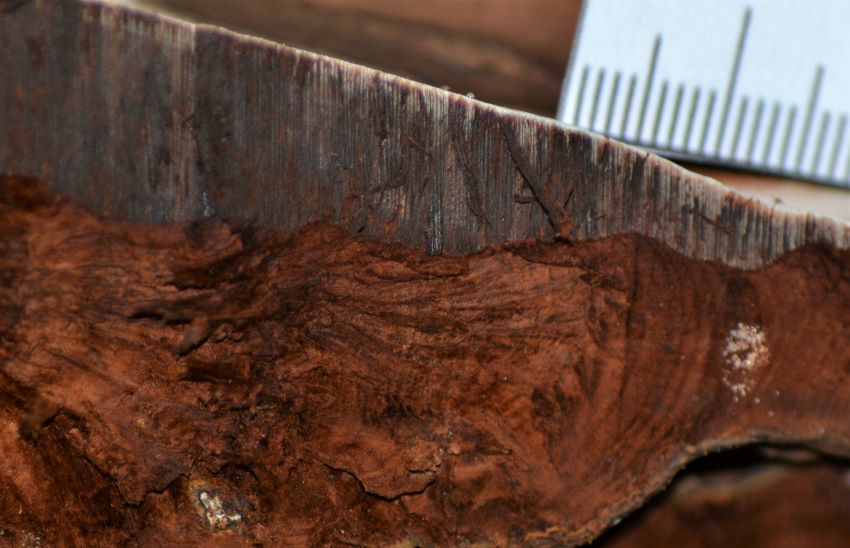 Pour répondre à Fouad, voici une photo de la coupe effectuée sur le plus gros champignon et une photo en gros plan. Par contre pour interpréter ça..., je dirai 4 ou 5 pores par mm mais pas certain du tout.