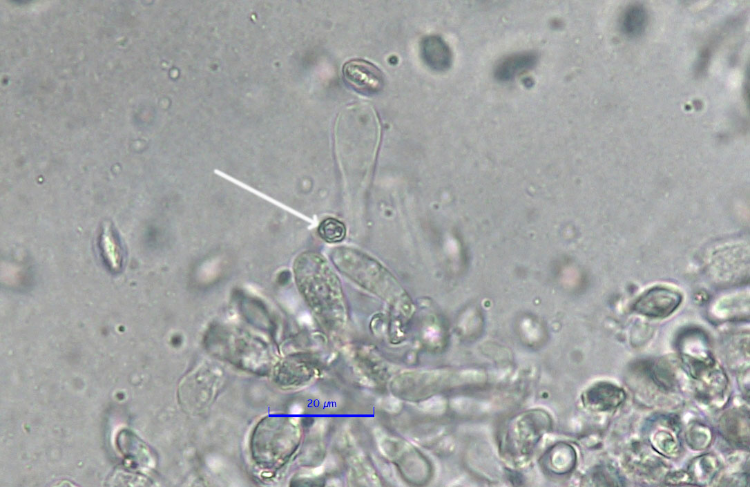 je maintiendrais bien l'hypothèse de Clitopilus cystidiatus au vu de la micro figurant sur MycoDB ... mais un examen (très) rapide ne m'a pas permis de trouver de cystides ...