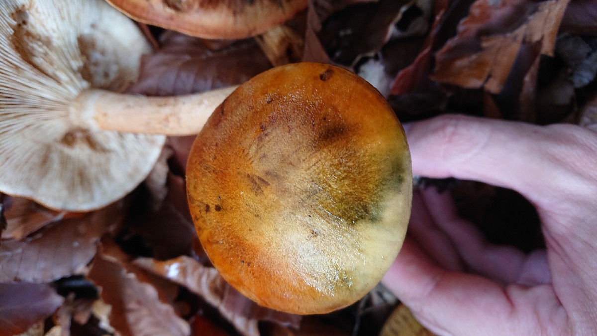 Nouvelle sortie aujourd'hui et je suis tombé nez-à-nez avec une superbe famille (enfin... au sens figuré...) de champignons oranges à teintes vertes : après utilisation du GEPR, je pense qu'il n'y a pas trop de doute, mais étant donné la rareté indiquée, je vous sollicite pour confirmation (d'autant que je ne l'ai pas trouvé sous les essences indiquées). Je pense qu'il s'agit de Tricholomes orangés (Tricholoma aurantium).