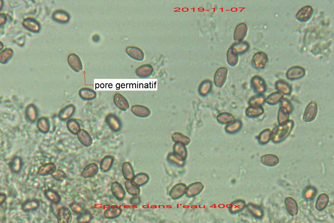 NSchwab a écrit :Une sporée sur un chapeau hyper-fragile de moins de 3 mm, je n'ai même pas essayé ; Mais simplement en écrasant une lame j'ai eu plein de spores matures (elles sont pas belles, mes spores... et elles sont bien brunes dans l'eau et sous l'oculaire)Richmond63 a écrit :Les dimensions du champignon et la couleur des spores ne collent pas.As-tu fait une sporée ? Tu peux aussi essayer d'observer les gléocystides.