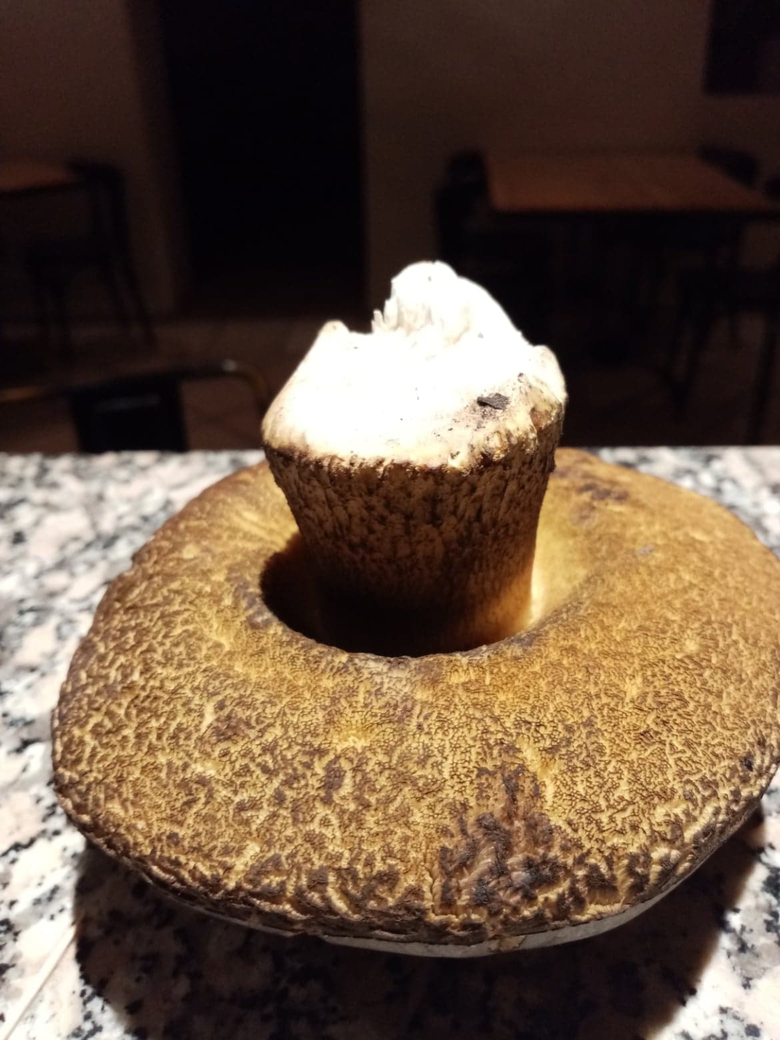 Chapeau : Relativement gros , Marron foncé uniforme , Bombé , Fissures (surtout chez les plus gros ) devloillant une chair brune, sec ( legerement humide pour les sujet moins âgés ) , ferme
