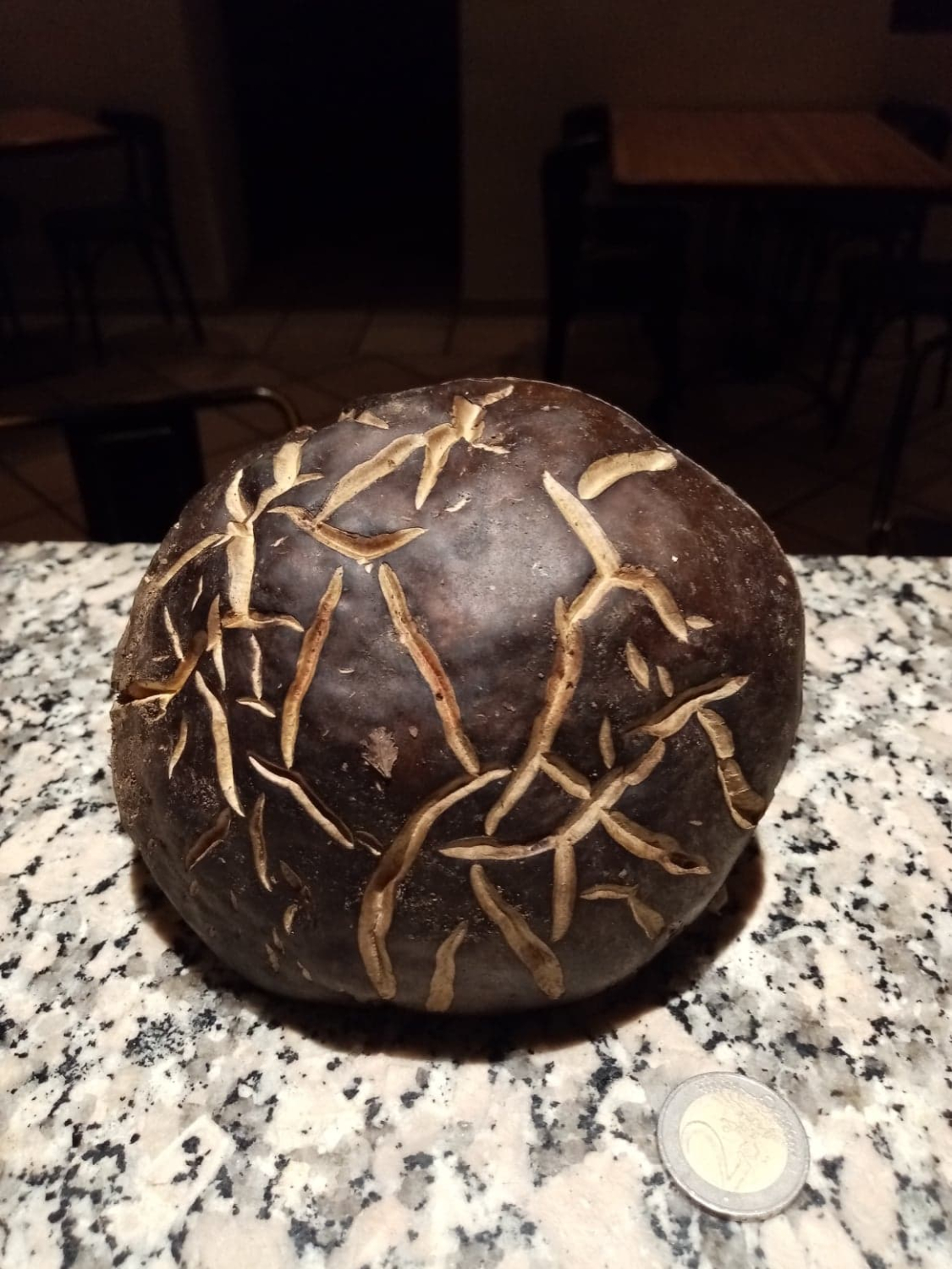 Chapeau : Relativement gros , Marron foncé uniforme , Bombé , Fissures (surtout chez les plus gros ) devloillant une chair brune, sec ( legerement humide pour les sujet moins âgés ) , ferme