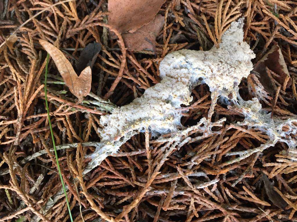 Ça pousse sur des aiguilles sous un sapin. impossible de le cueillir pour voir dessous, ça se transforme en bouillie informe dès que je le touche. Ça ne donne pas non plus envie de le goûter et ça ne sent rien.