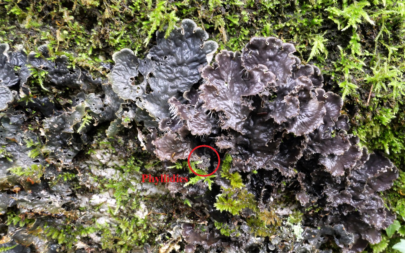 Merci pour toutes ces explications utiles à nos lecteurs et que je vais pour ma part m'empresser d'oublier, j'ai juré de ne rien apprendre sur les lichens ! Mais dis-moi, je croyais que tu n'avais que quatre filles : la grande, Apothécie, tes jumelles Sorédie et Soralie, et la petite dernière, Isidie. Mais, cachottier, t'en avais une cinquième : Phyllidie !