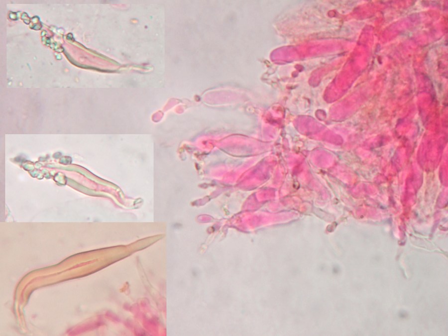 voici des hohenbuehelia sur chêne tombé.. les aspects mciro envoie vers atrocaerulea.. mais alors aucune trace de bleuté.. je vois une espèce qui semble proche : H. algida ? je ne sais si elle est valide et je n'ai pas le dernier opus sur les Hohenbuehelia et Resupinatus.. les cystides métuloides ne dépassent pas les 50 microns spore en moyenne 8.8 x 4.5 microns