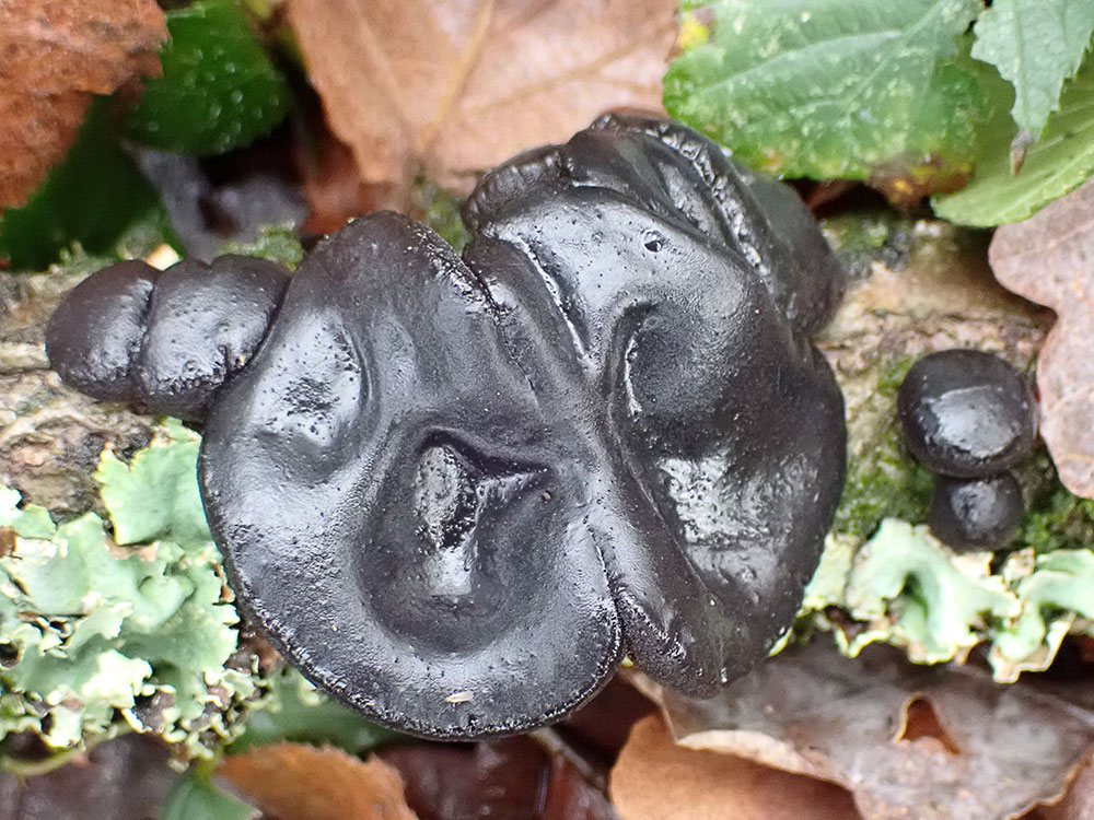 Géographiquement proche de ceux-ci, mais de forme différente, discoïdale, et sur branche morte au sol de chêne, je propose de nouveau Exidia glandulosa ?