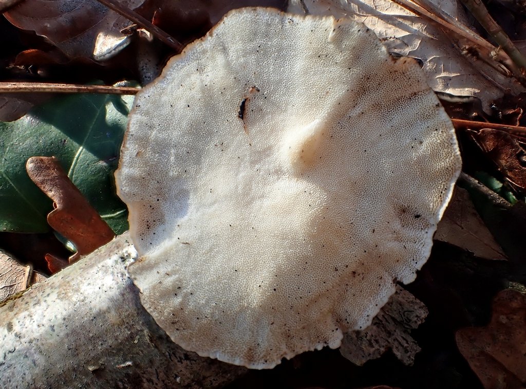 Champignons trouvés en janvier sur une branche morte de feuillu. Si ce que je prends pour le dessous est bien le dessous (mais il était au dessus quand je l'ai trouvé, tout le monde me suit ?