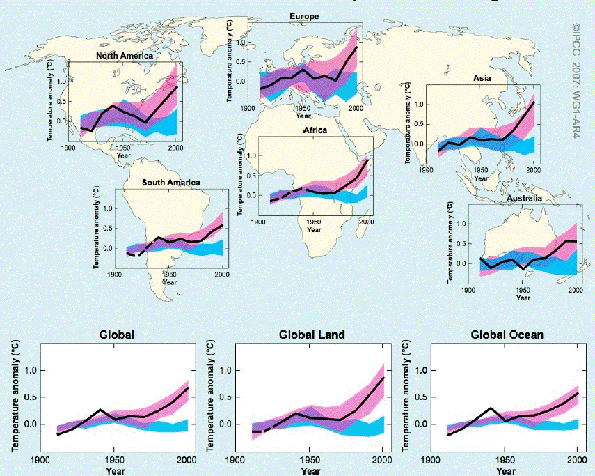 il est évident que les modèles ne savent pas reproduire ce qui s’est produit depuis 1970 sans faire intervenir les émissions d’origine humaine : en particulier le réchauffement observé depuis 1970 semble bien être, avec une probabilité très faible de se tromper, le début de l’influence de l’homme sur le climat.
