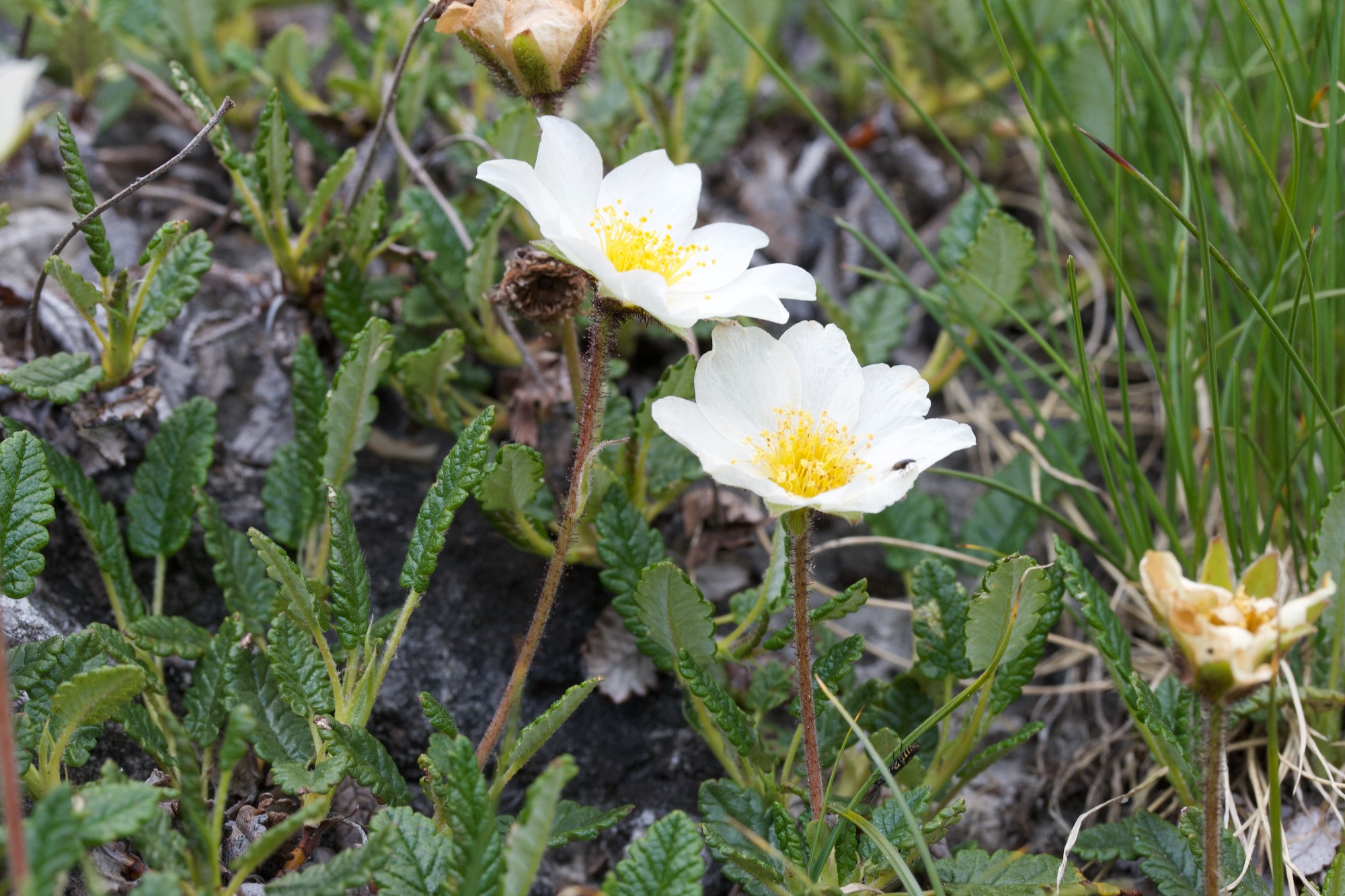 Cette petite espèce est assez commune dans les pelouses et les rocailles du Jura, des Alpes et des Pyrénées. C'est une plante vivace à tige rampante, ligneuse, qui peut atteindre cinquante centimètres. Les racines hébergent une bactérie fixatrice d'azote atmosphérique. Les feuilles, vertes en dessus, blanchâtres en dessous, sont lobées comme celles du chêne. Les grandes fleurs blanches, solitaires, ont généralement huit pétales. Les fruits, nombreux, sont prolongés par un longue arête plumeuse