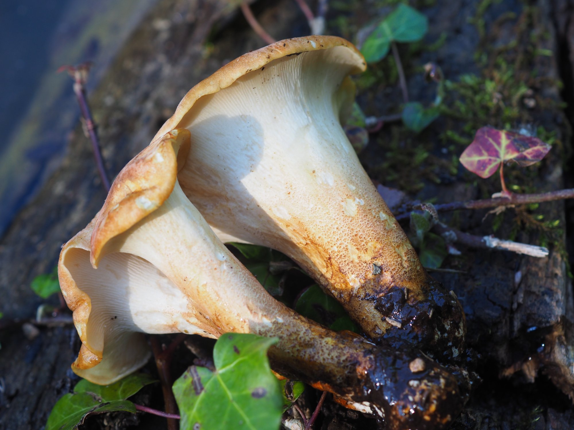 Attention, ce n'est pas un Pleurotus ;-) Le pied est tout de même très central et la chair très (trop) coriace. En outre, les lames sont mal formées et très serrées...