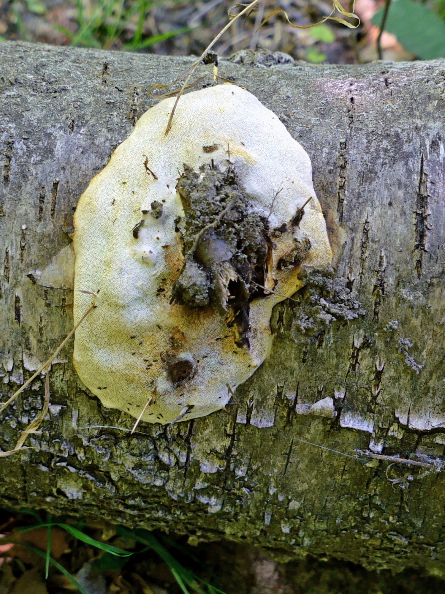 - 1) sur un autre rondin de bouleau au sol à moins d'un mètre (aïe la distanciation) , il y avait plusieurs F. pinicola, dont ceux-ci : - 2) tous les bouleaux morts ou moribonds de cette zone humide sont couverts à 10% de Fomitopsis betulina... et à 90% de Fomitopsis pinicola, c'est là que j'ai photographié en 2017 ce tronc qui portait une soixantaine de consoles : et (sur le même), cet exemplaire qui figure dans la galerie : - 3) sur le petit morceau que j'ai rapporté, la potasse sur les pores, les tubes et la chair produit une réaction rouge (rouille), virant au noir.