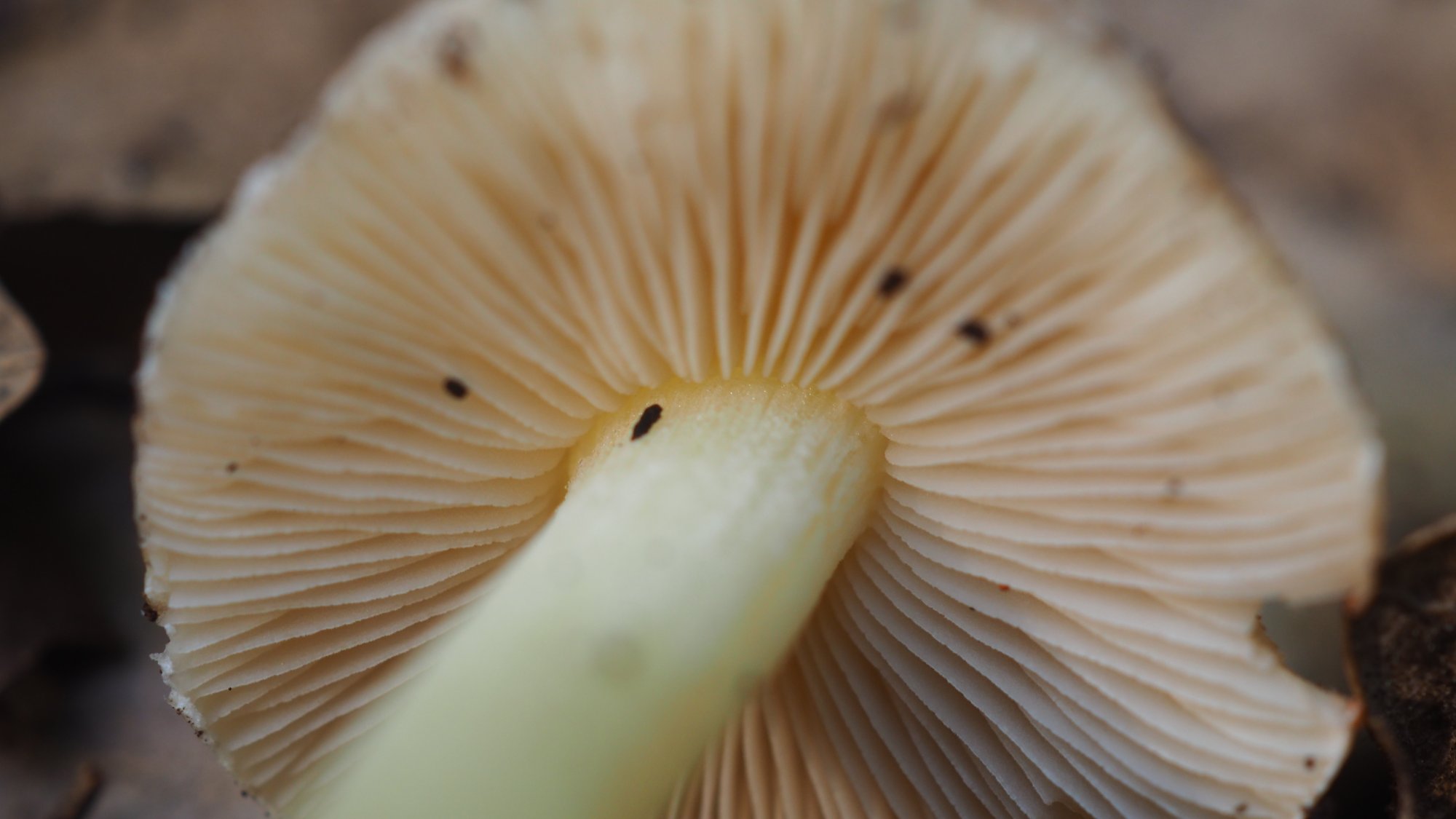 Pied : fibrilleux, bulbeux, blanchâtre avec tonalités jaunâtre très très claires.