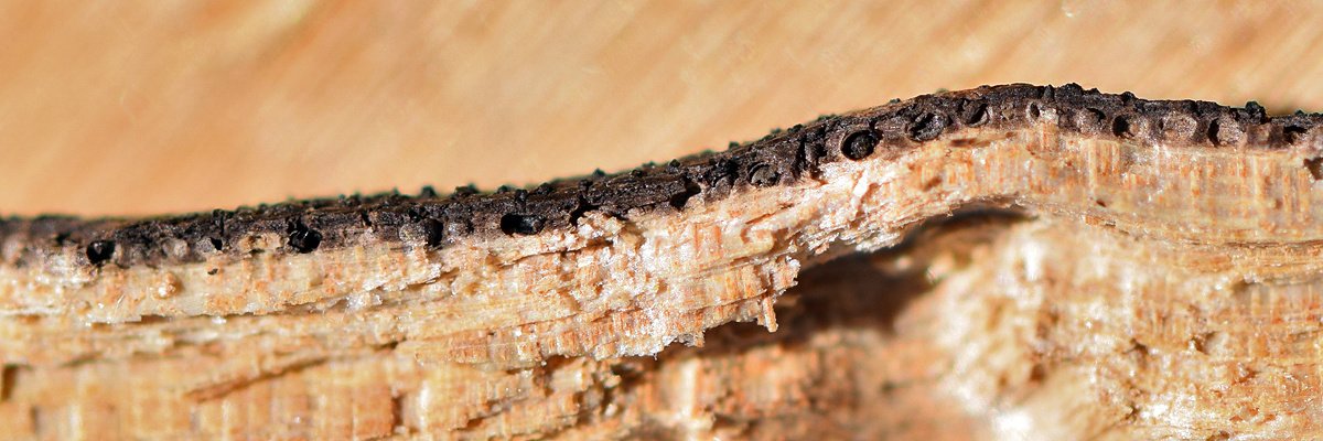 Une coupe de la couche noire (stroma) permet de voir des périthèces profondément immergés sous la couche superficielle noire.