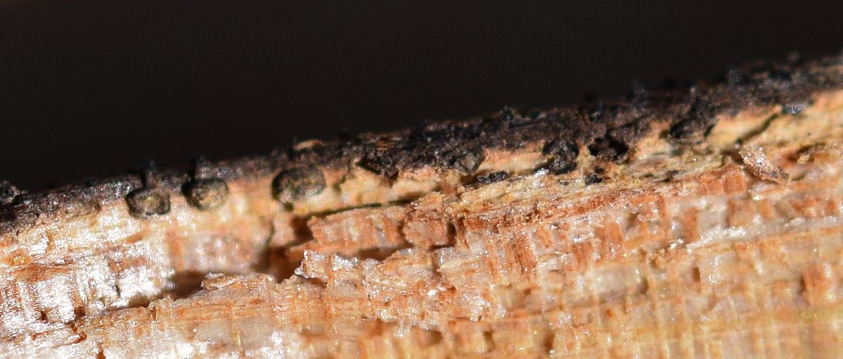 Je ne peux pas vous le montrer, c'est trop petit pour les photographier, et je ne suis pas équipé de loupe binoculaire, mais je vois à la loupe de périthèces semblables à ce que l'on voit sur ce sujet : Eutypa lata, Eutypa maura?.