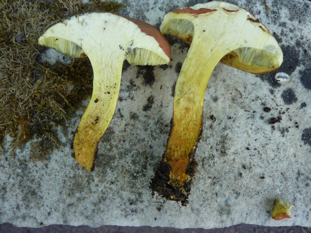 X. chrysonemus aurait une chair plus jaune à la base, je pense : ici, on tire plutôt sur l'orange. Par ailleurs sa chair est immuable, d'après mes notes. Ici, on constate un léger bleuissement autour des tubes.