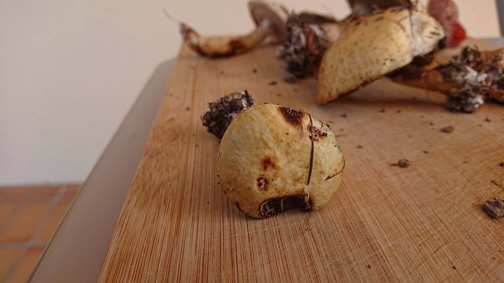 Tout d'abord, je commence par une vue du chapeau : Ce qui m'a surpris dans un premier temps, c'est la présence de tons jaunes assez évidents (en tout cas à l'oeil, peut-être plus que sur la photo). C'est le cas aussi bien sur le chapeau (c'est du jaune très pâle, j'en conviens) que sur le pied (où c'est peut-être un peu plus évident).