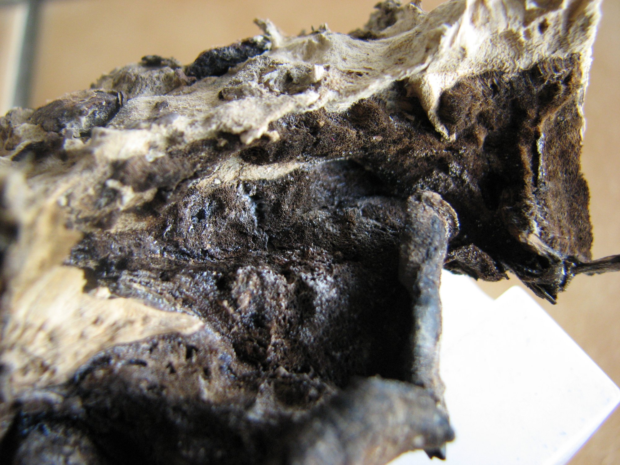 Je continue de regarder ce bidule desséché (à quoi on en est réduits, bis) : les tons sont ceux de adusta, tant la surface stérile, avec les zonations brunâtres près de la marge, que l'hyménium, carrément gris-cendre sans aucune nuance de rose. J'en resterais à B. adusta, ce qui n'empèche évidemment pas de faire la micro.