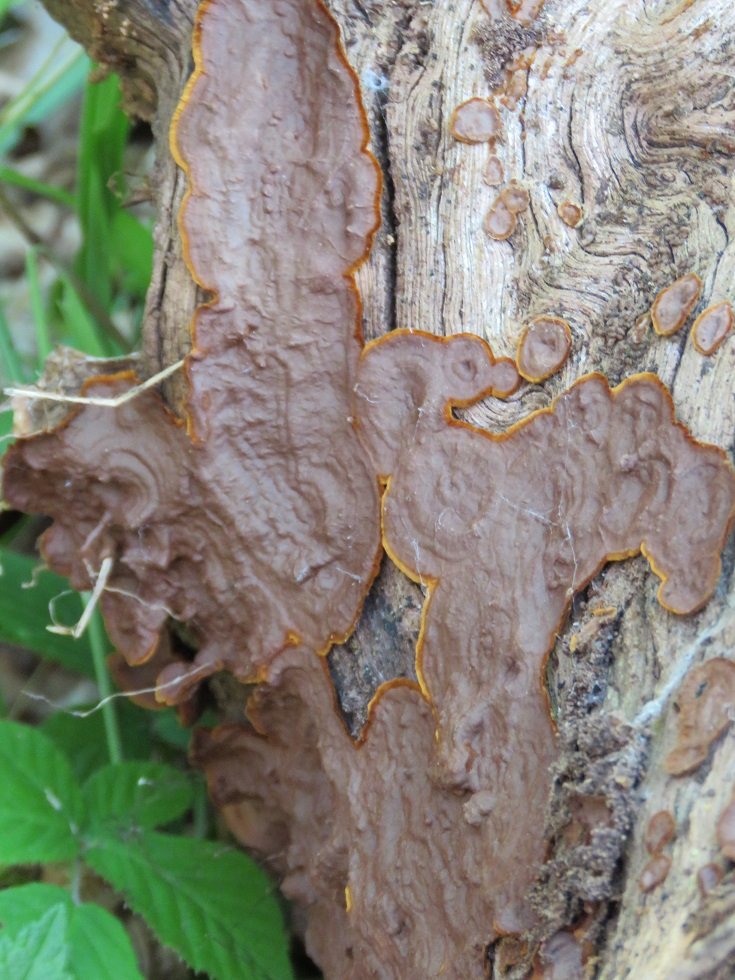 Des hésitations entre Hymenochaetopsis tabacina et Hymenochaete rubiginosa.
