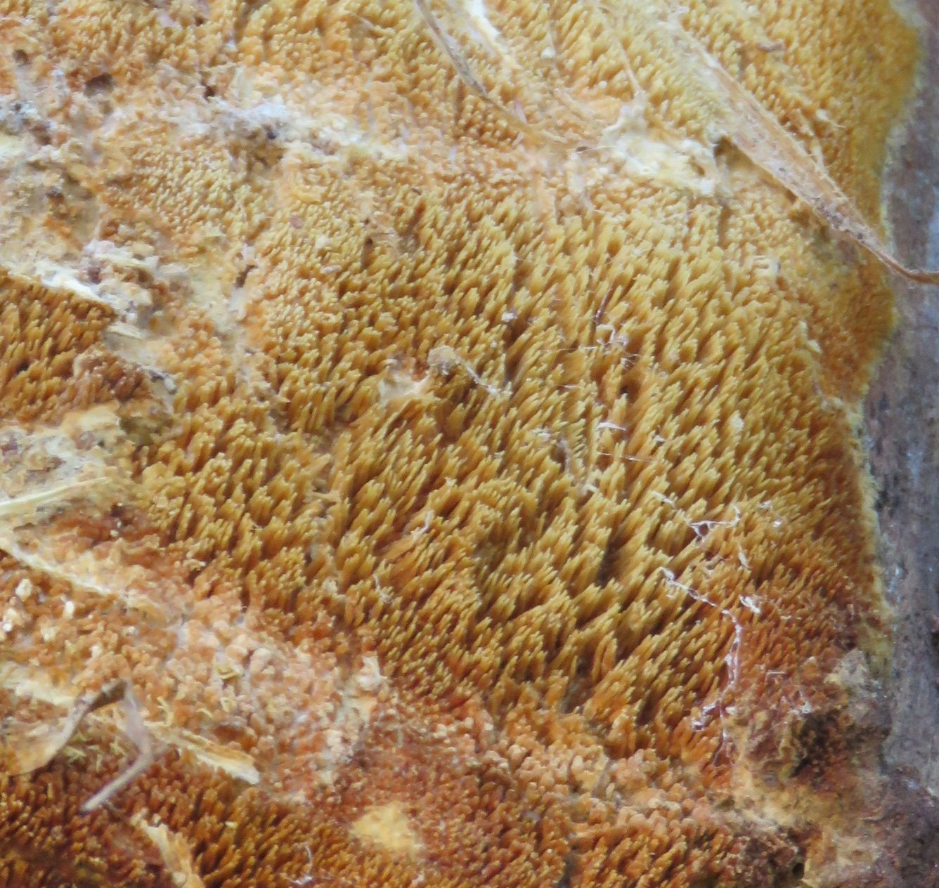 Voici quelques photos d'un champignon résupiné observé sur une vieille grume de feuillu, le 15 août dernier, commune de Grand-Vabre (12). En consultant l'ouvrage des champignons de Suisse de Breitenbach et Kranzlin (Tome 2), j'ai noté une belle ressemblance avec Mycoacia aurea. J'ai notamment observé que les aiguillons étaient rarement isolés et le plus souvent connés à la base, pourvus d'excroissances latérales terminés par plusieurs pointes (souvent 2 à 3).