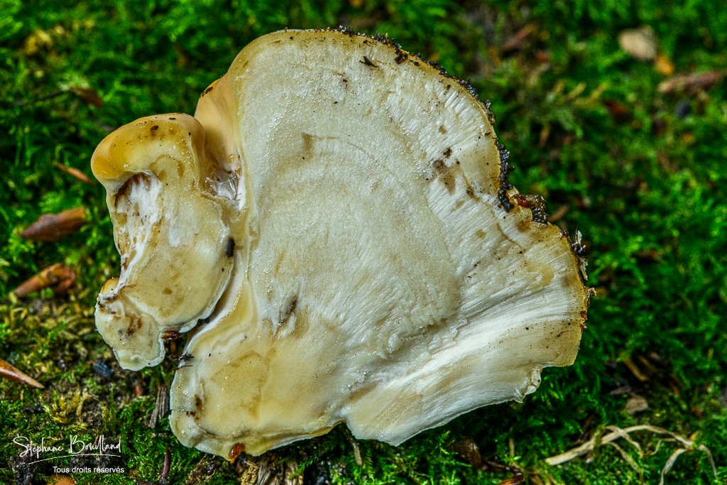 Chez les jeunes la chair est jaune et pour ce qui est du support je l'ai déjà trouvé sur hêtre et au pied d'un cerisier.