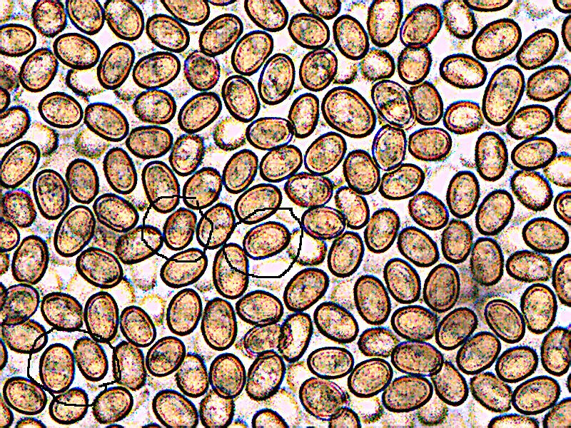 Voici une autre photo, plus colorée. Un certain nombre de spores présentent une petite zone blanche au bout.