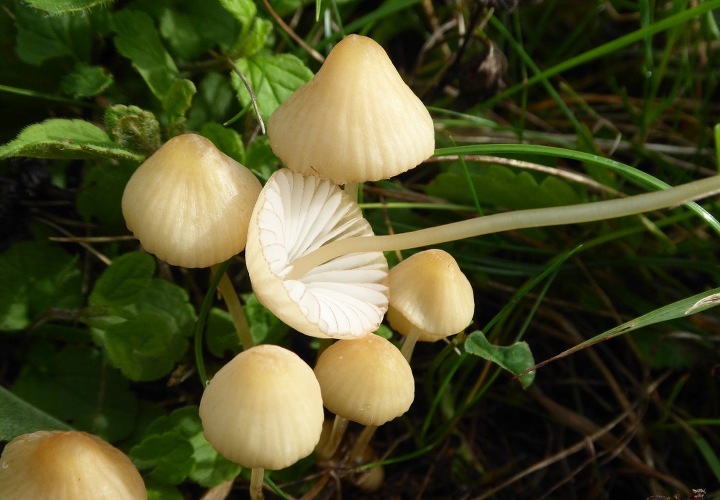 Voici quelques exemplaires de cette mycène à lames bordées de rougeâtre, qui semble très polymorphe, si ma détermination est bonne. Aucun arbre aux alentours, plein gazon.