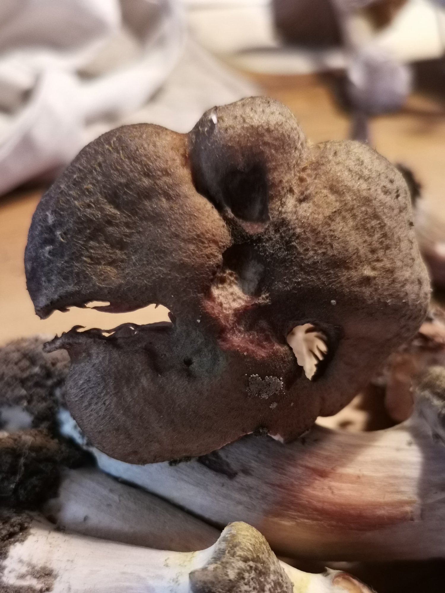 Chapeau jusqu'à 5cm, brun foncé chez les plus jeunes, un peu plus clair sur le plus vieux. Entièrement feutrés et le plus vieux est couvert de très fines mèches.