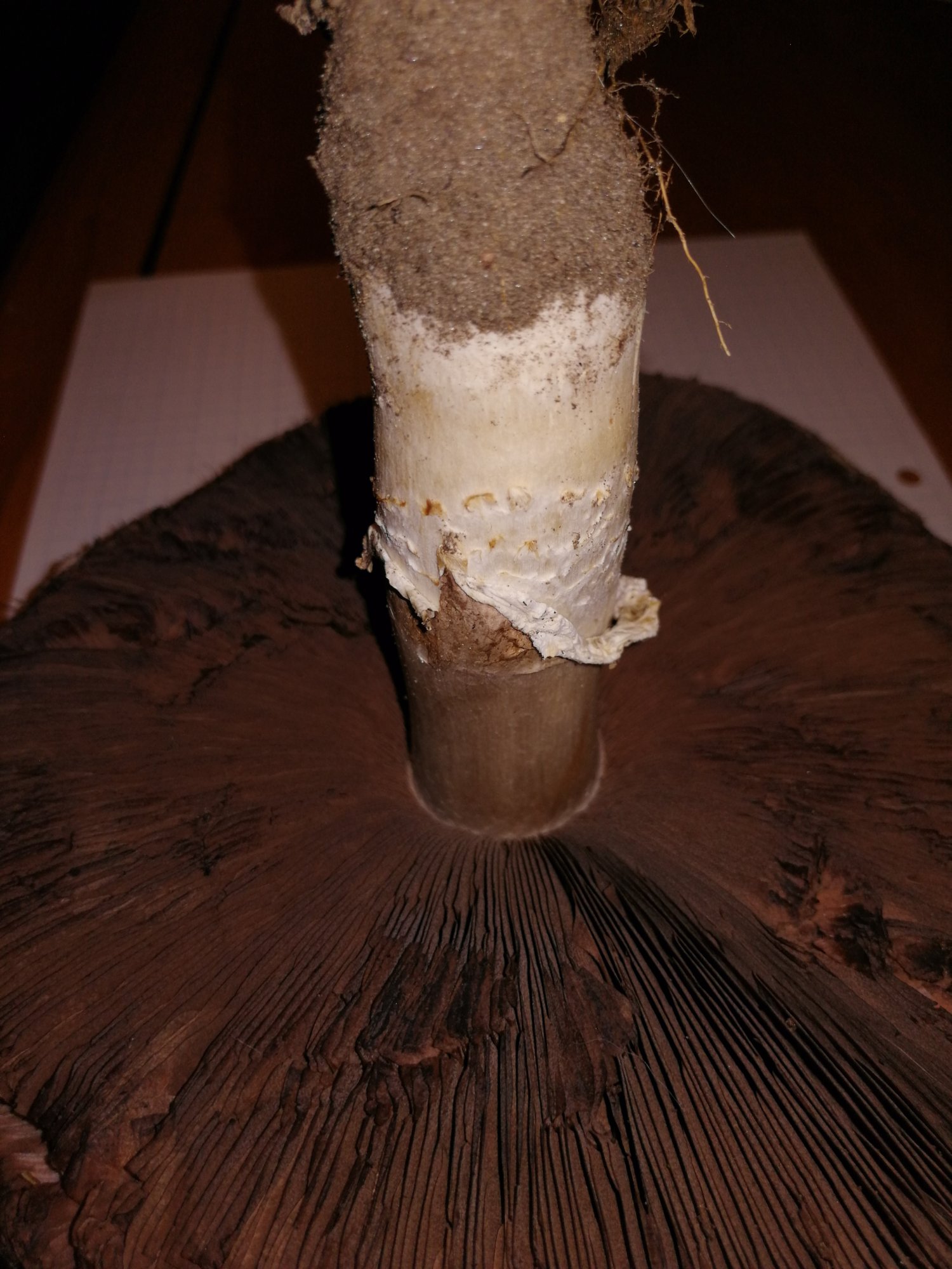 J'ai besoin d'aide pour déterminer ce champignon. Je suis partie sur un agaric mais je ne comprends pas bien son pied... Un espèce d'anneau se forme mais il s'agit en fait de la peau du pied qui est remontée... Diamètre chapeau: 18 cm, diamètre stipe: 3,5 cm. Quelques indices à me donner?