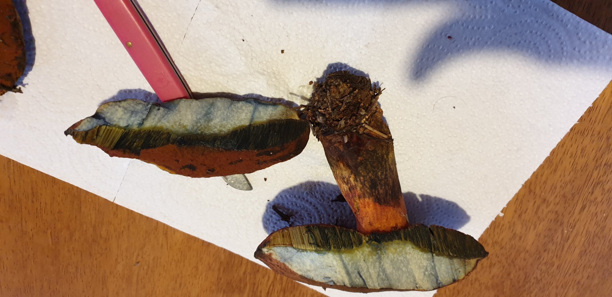 @Bogue, c'est une bonne idée de montrer la couleur de la chair en coupe, cependant la coupe est incomplète. Dans le cas des bolets (et de quelques autres genres) il faut faire une coupe du chapeau jusqu'en bas du pied, cela permet de voir la couleur de chair sur l'ensemble du champignon.