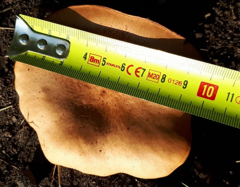 Oui, Hygrophoropsis aurantiaca, un exemplaire de grande taille. L'espèce pousse plutôt sous les pins, il n'y en a aucun dans les environs ? Non, la chair n'est pas blanche, elle est jaune orangé pâle.