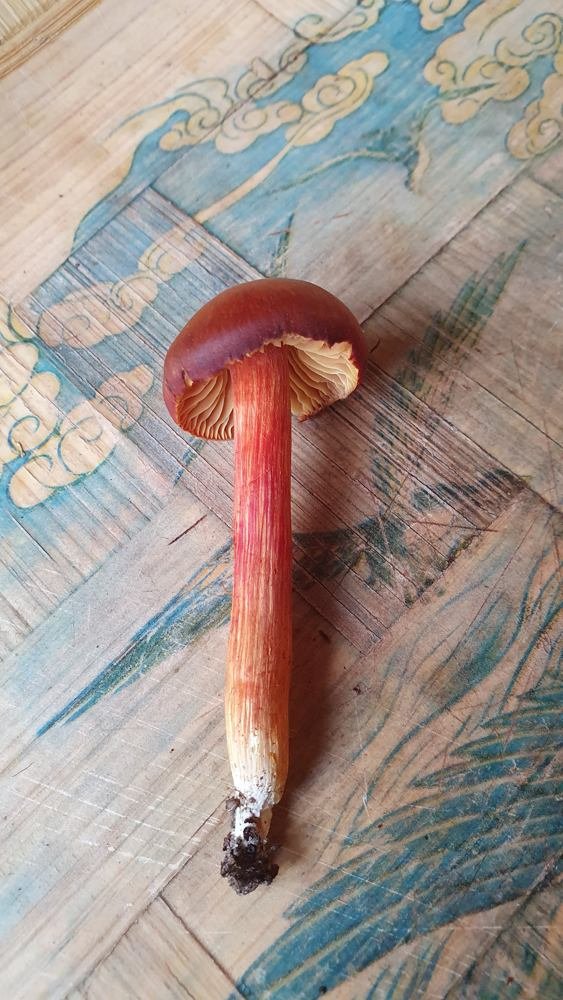 Chapeau : plutôt conique environ 4 cm, rouge sombre, se décolorant en rouge orangé, charnu, légèrement strié au bord, un peu gras au toucher