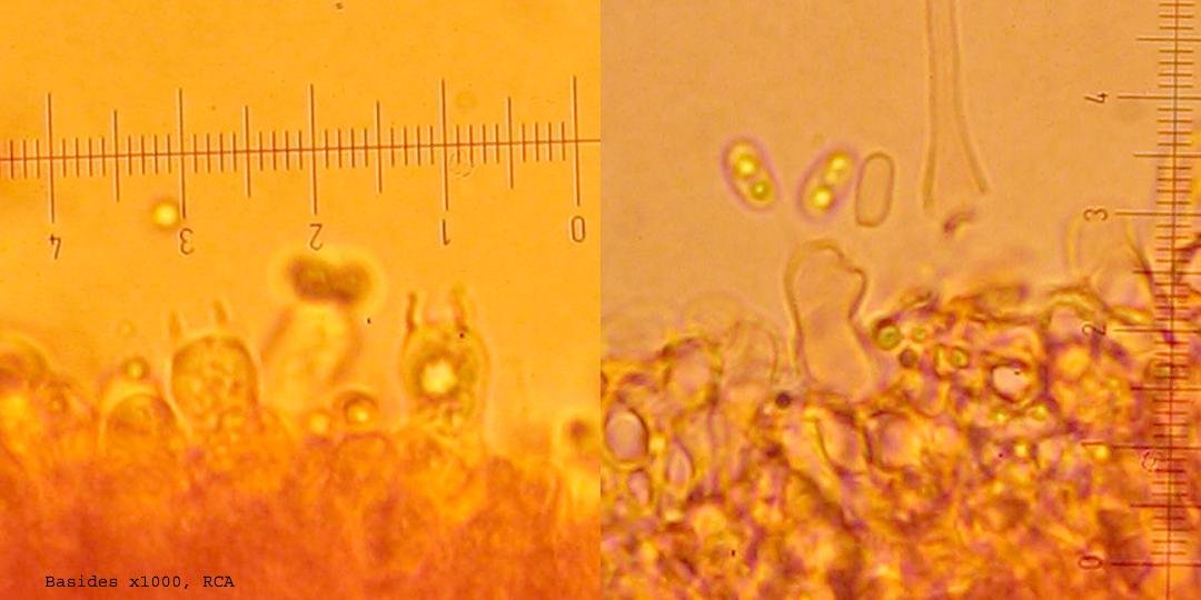 Pour cette récolte, après avoir été sur la piste de Steccherinum collabens proposée par Christian Fritz, j'ai préféré solliciter notre spécialiste de la SMS : Gérard Trichies - coauteur dans 'Polypores'. Bien entendu, G. Trichies ne pouvait déterminer cette récolte sur la base de mes photographies. Je fais un premier envoi de matériel qui se perd, puis un second qui s'avère pauvre en spores. Toutefois, Monsieur Trichies a eu la gentillesse de me communiquer son avis sur cette récolte, en se basant en partie, sur mes mesures sporales. Le descriptif de l'espèce dans 'Polypores' ne mentionne pas cette couleur ! Pour dire que c'est difficile d'y arriver.