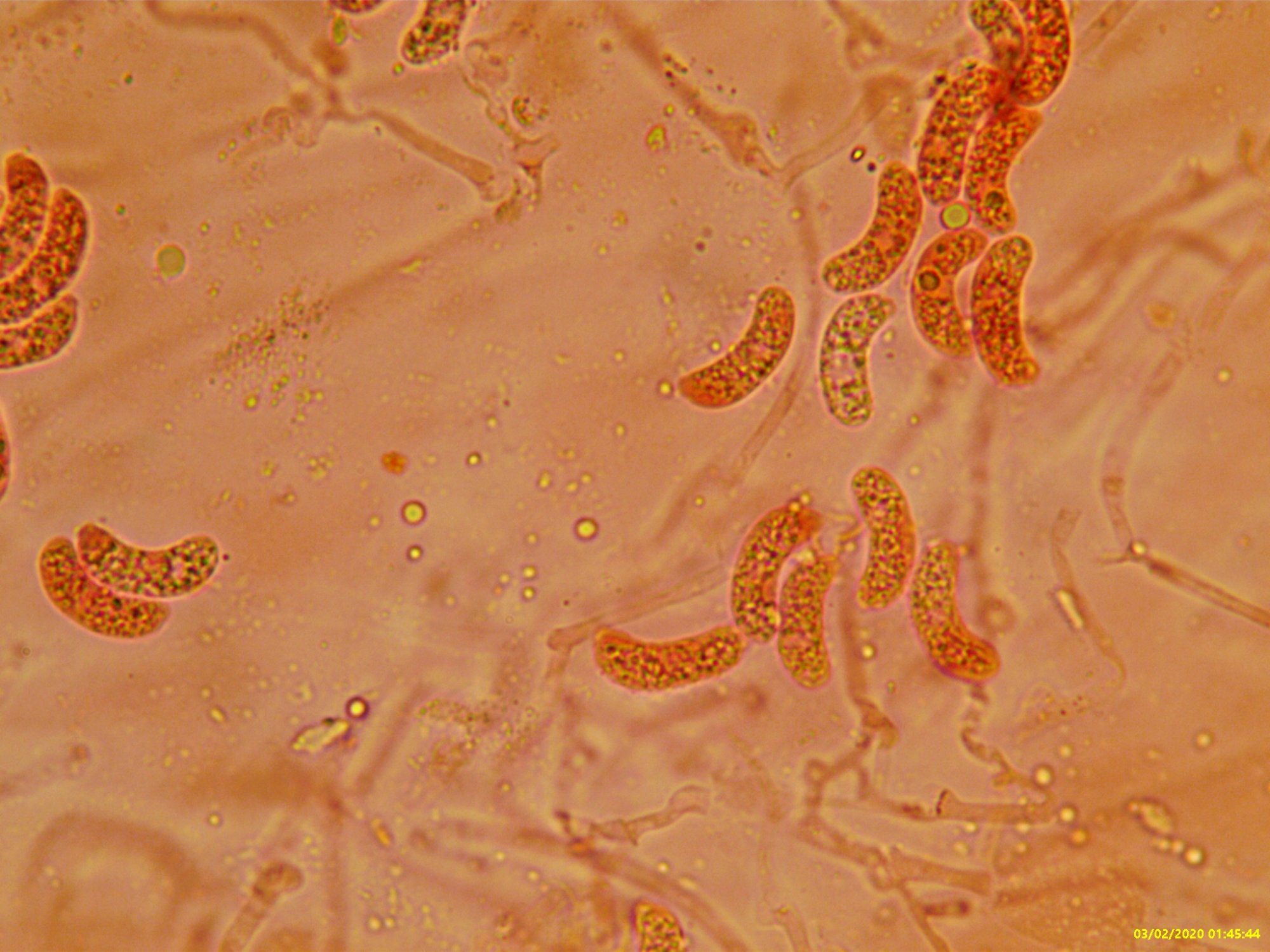 Voilà pascal ; les spores d'Exidia truncata des specimen de janvier 2020, apparus sur billons de chênes ramenés sur ma terrasse..